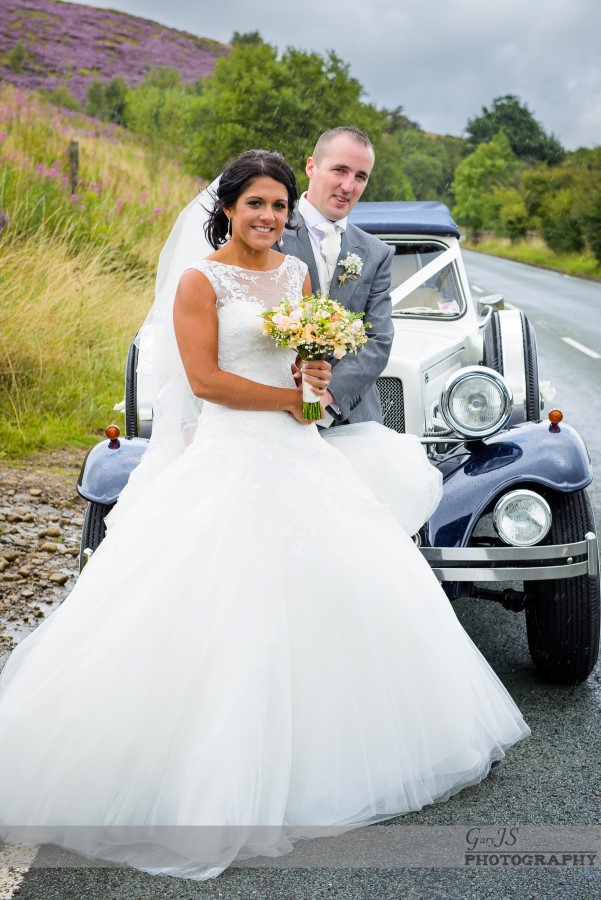 Unfortunately, just to prove I can’t always be lucky with the weather, the heavens opened and the wind howled when we were due to take some of the photos but we stopped (very briefly) on route to the White Heart and got a quick picture with the car (I fear we might have seen Lisa floating off into the sky if we’d opened an umbrella)!